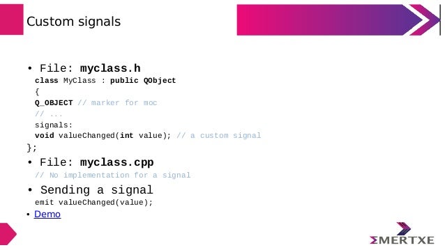 Compiler can help us detect type mismatches. Signals and slots are loosely coupled: a class which emits a signal neither knows nor cares which slots receive the signal. Qt's signals and slots mechanism ensures that if you connect a signal to a slot, the slot will be. Part 1 - How Qt Signals and Slots Work; Part 2 - Qt 5 new syntax. Or is about to emit the signal that will wait for the parent thread, which won't go back to its.